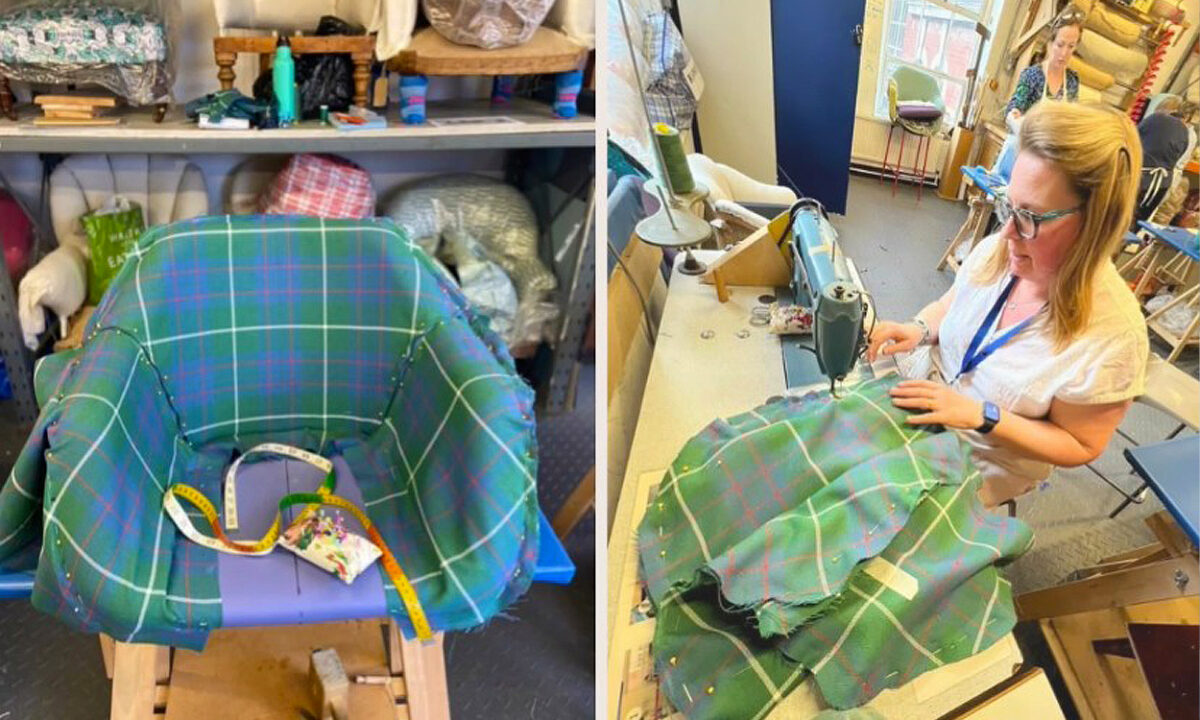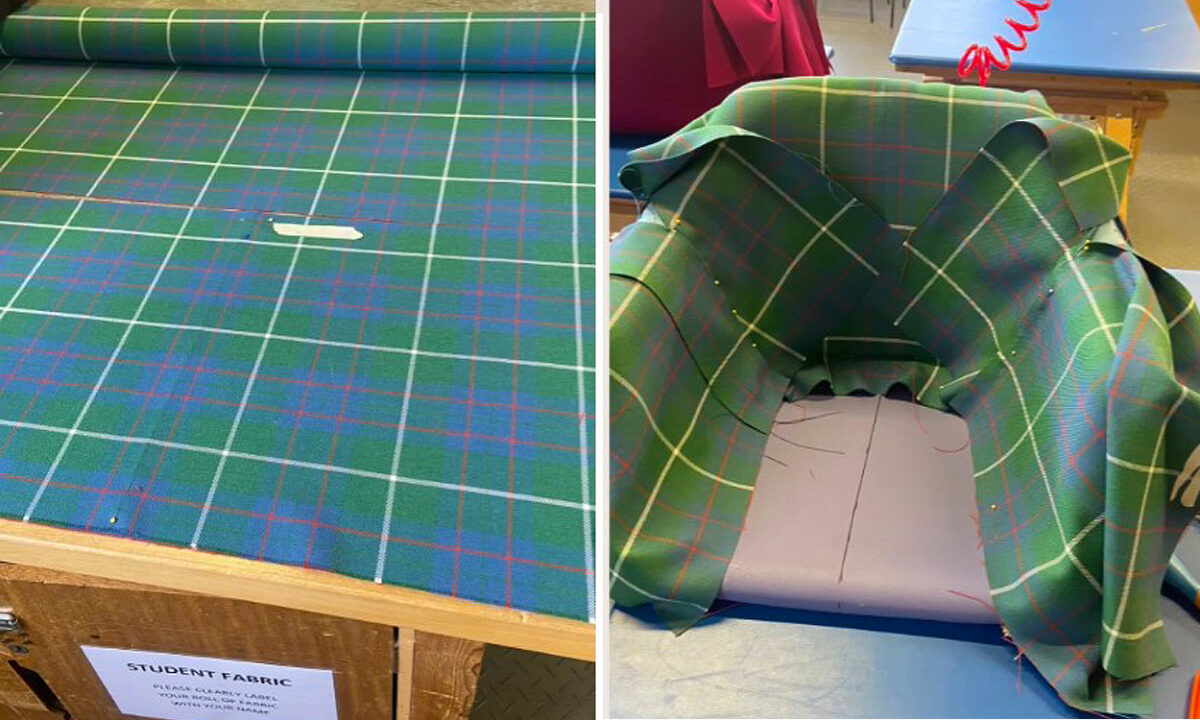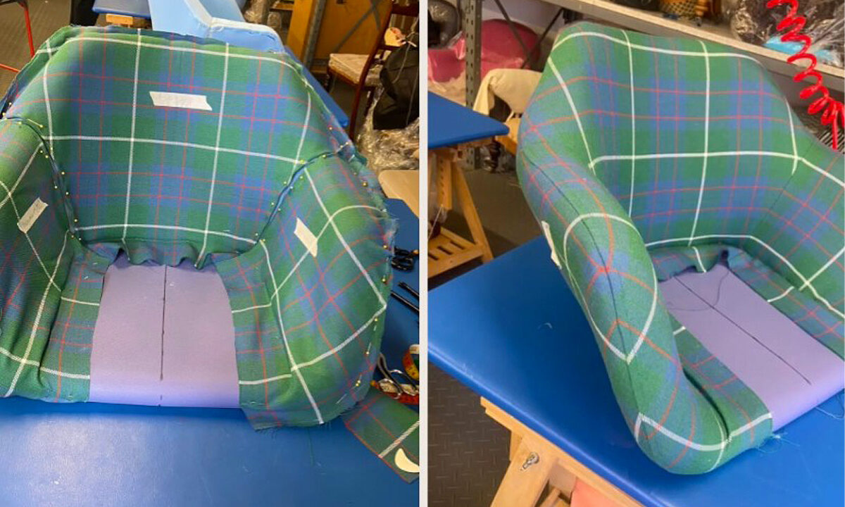From here, the tartan was sewn using a sewing machine and carefully fitted to the frame, creating the final piece.